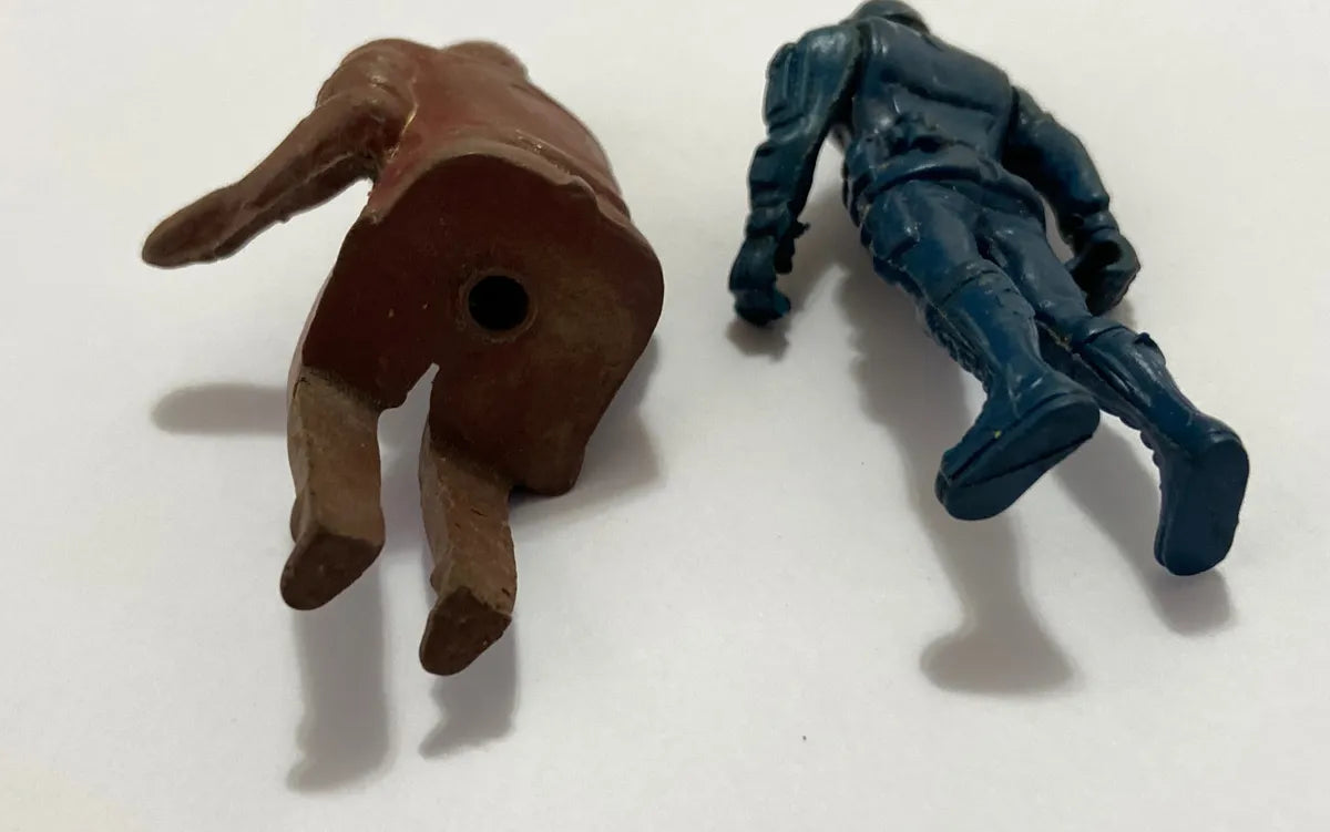 1 figura em plástico marrom, estilo piloto ou motorista, com pernas moldadas para assento (possivelmente usado em veículos de brinquedo).