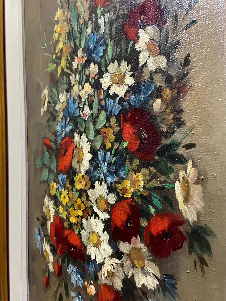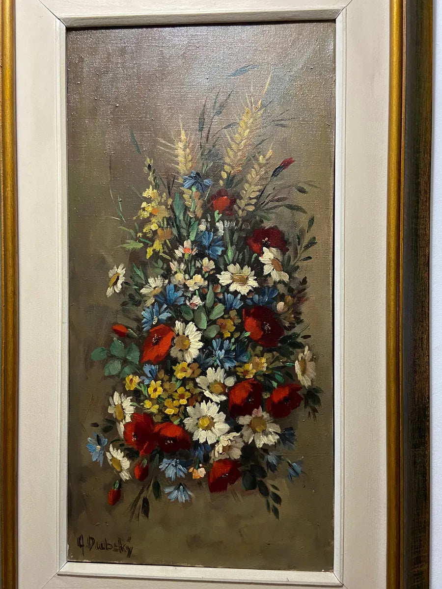 Linda pintura a óleo sobre tela assinada por A. Dubsky (Anna Haupt Dubsky), representando um exuberante arranjo floral com margaridas, papoulas vermelhas, espigas de trigo e flores campestres variadas.