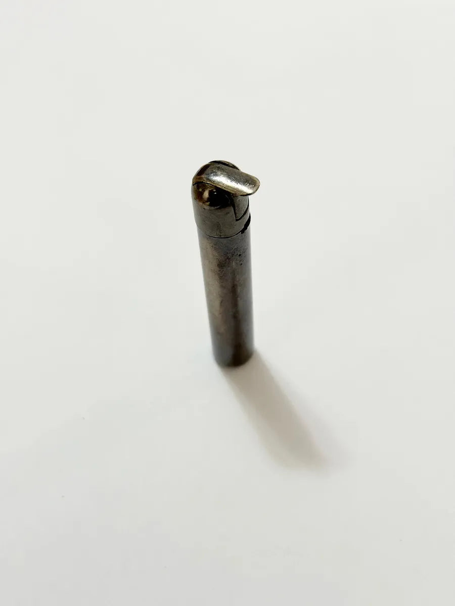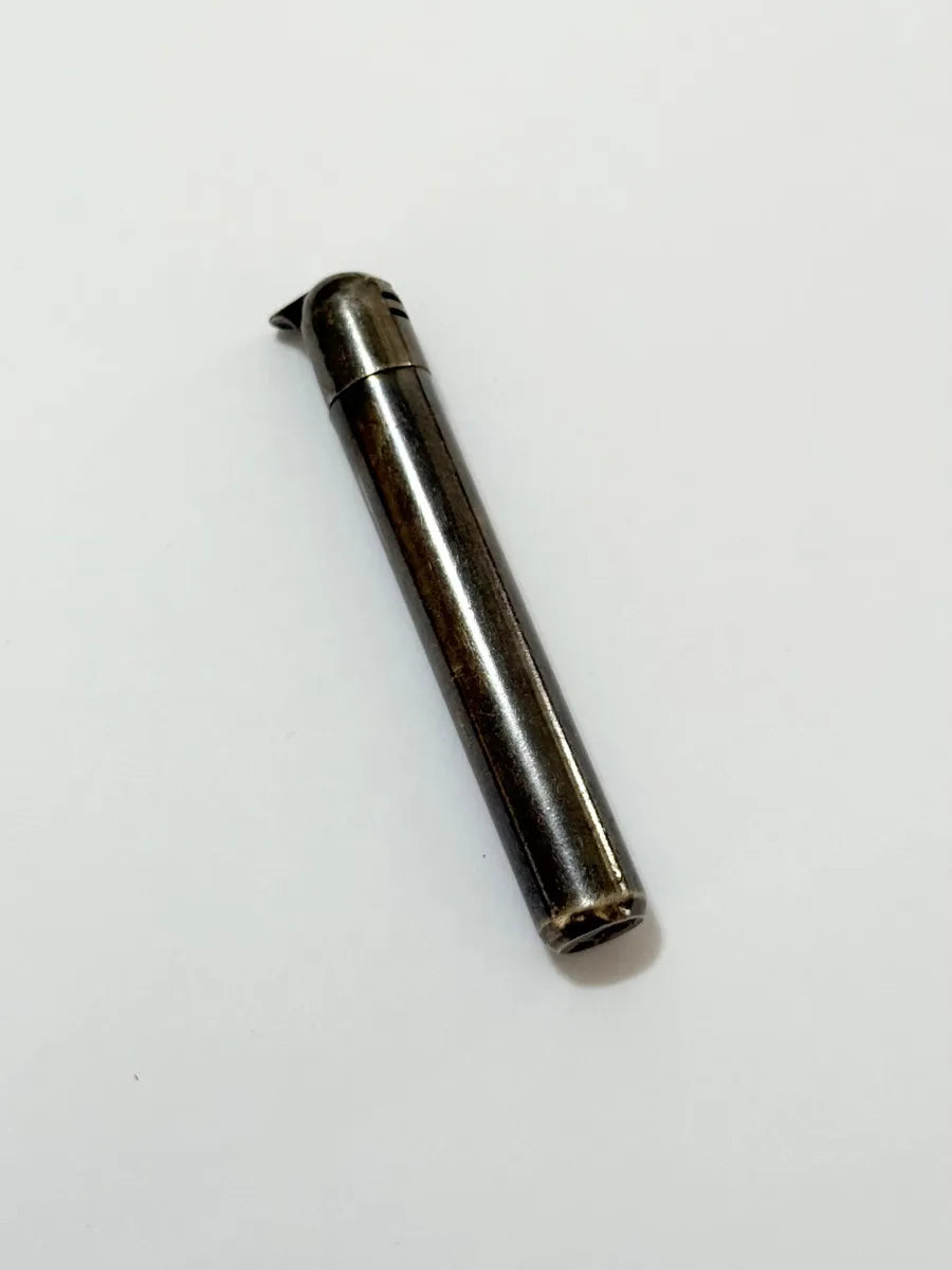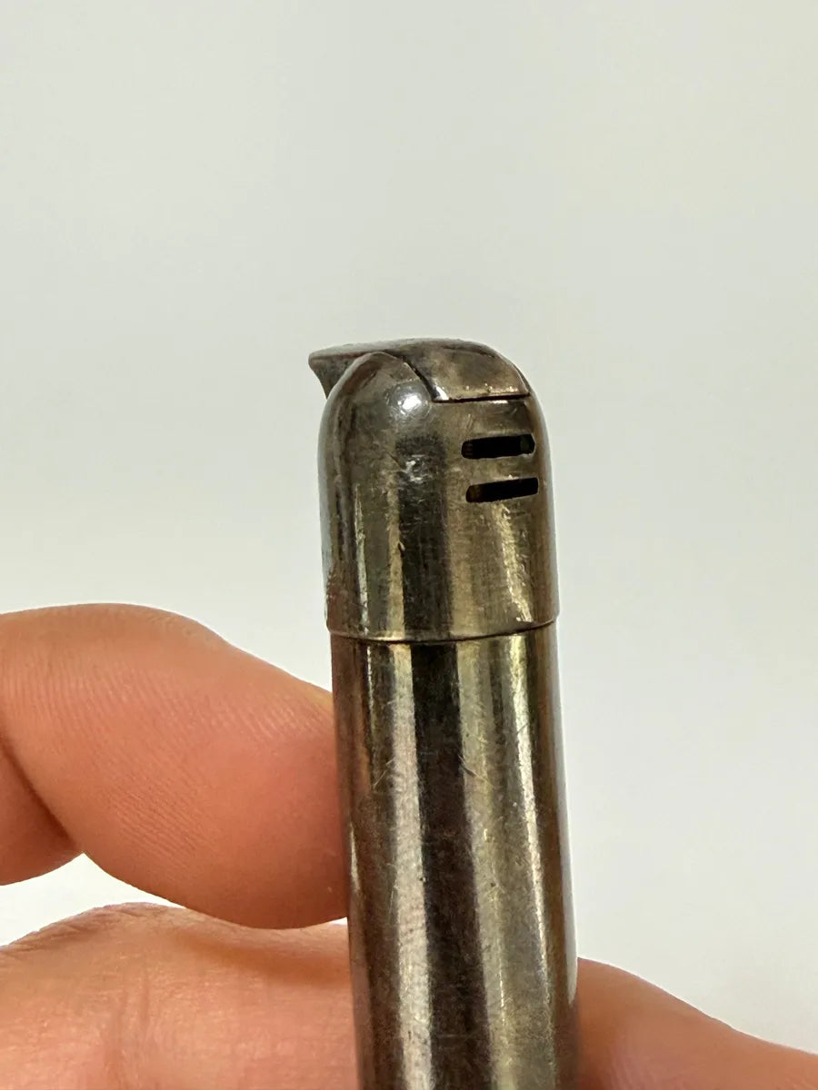 Isqueiro antigo em metal, formato cilíndrico, compacto, medindo aproximadamente 8,5 cm. Possui tampa articulada e respiros laterais, com acabamento metálico original.