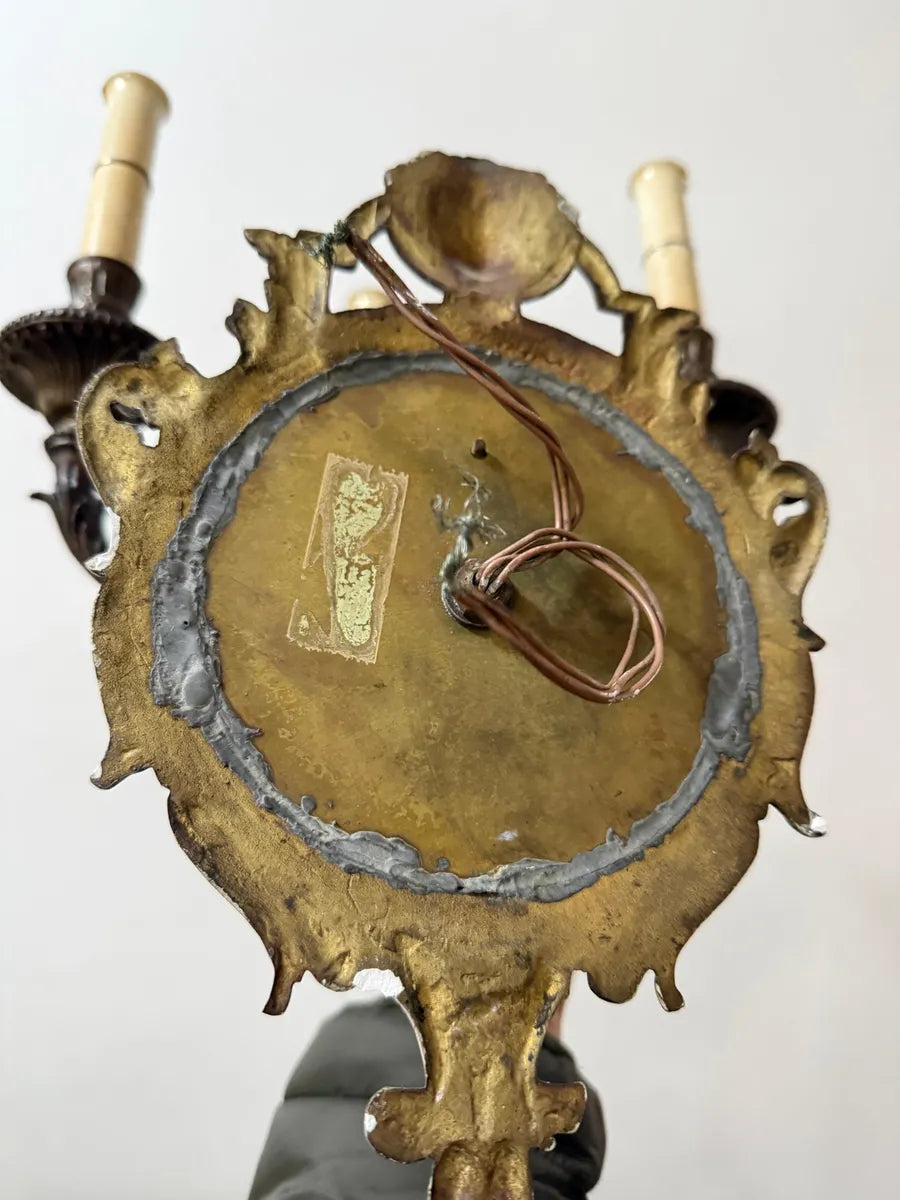 Par de arandelas de parede antigas em bronze maciço, estilo Clássico Francês Luís XV, ricamente ornamentadas com arabescos e conchas. Cada arandela possui 3 braços em formato de vela.