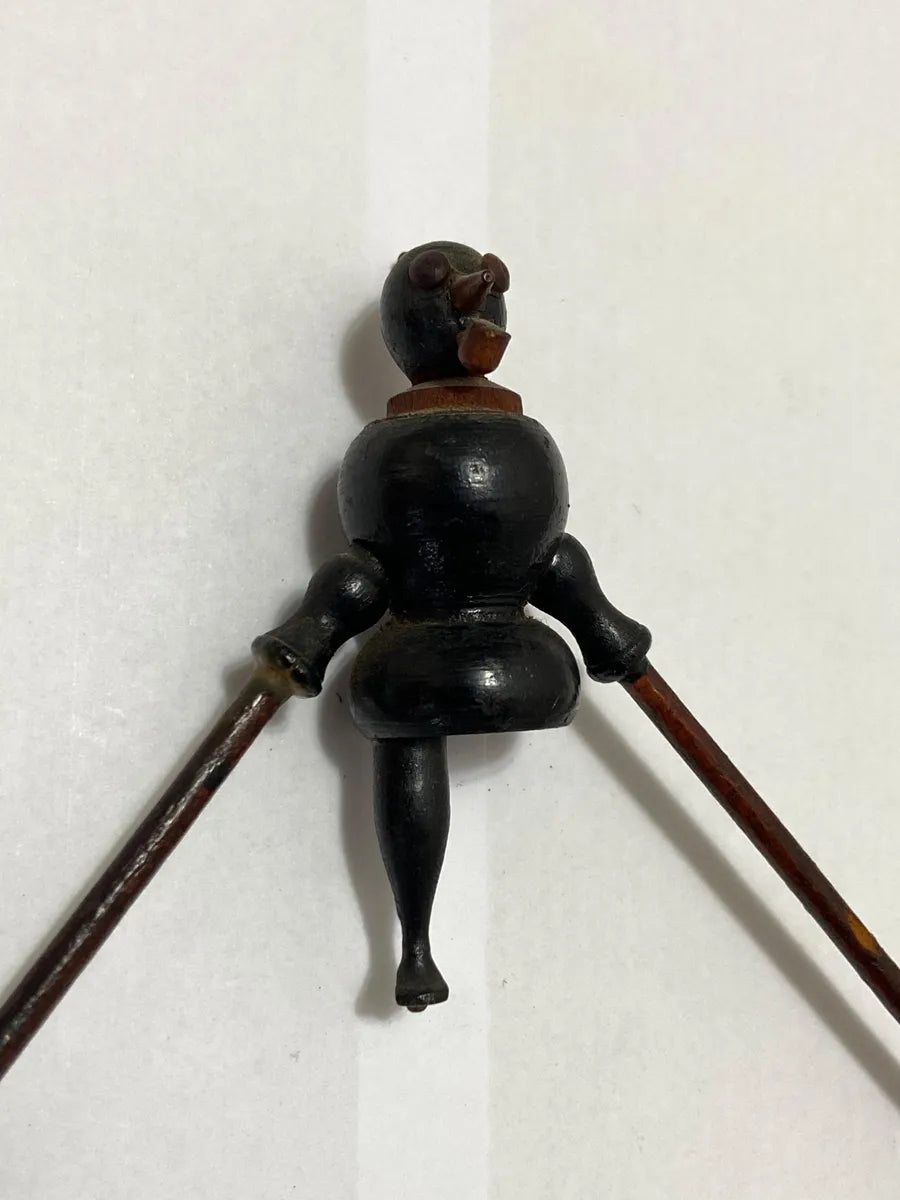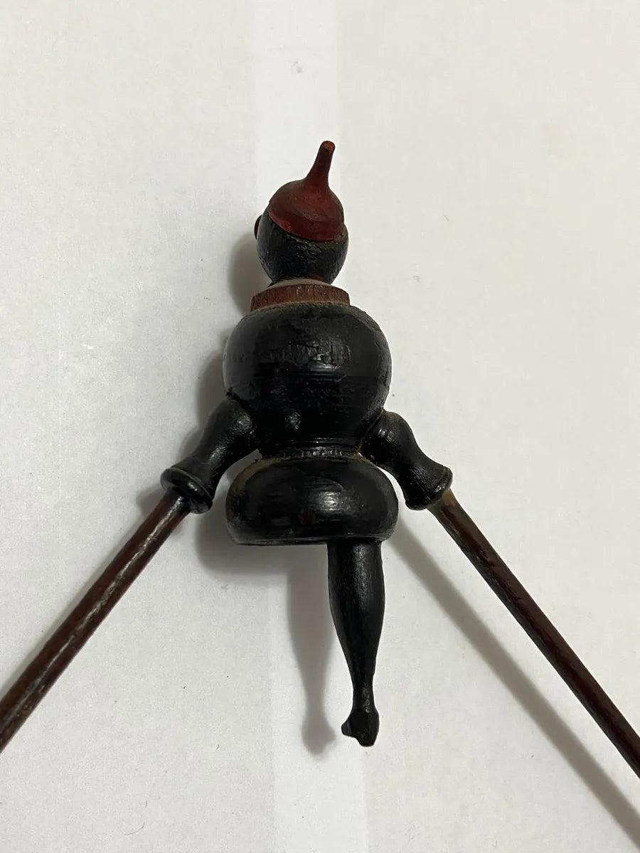Raro brinquedo antigo representando o Saci equilibrista, feito artesanalmente em madeira jacarandá. A peça traz o personagem do folclore brasileiro em posição de equilíbrio, sustentando esferas nas extremidades dos braços móveis.