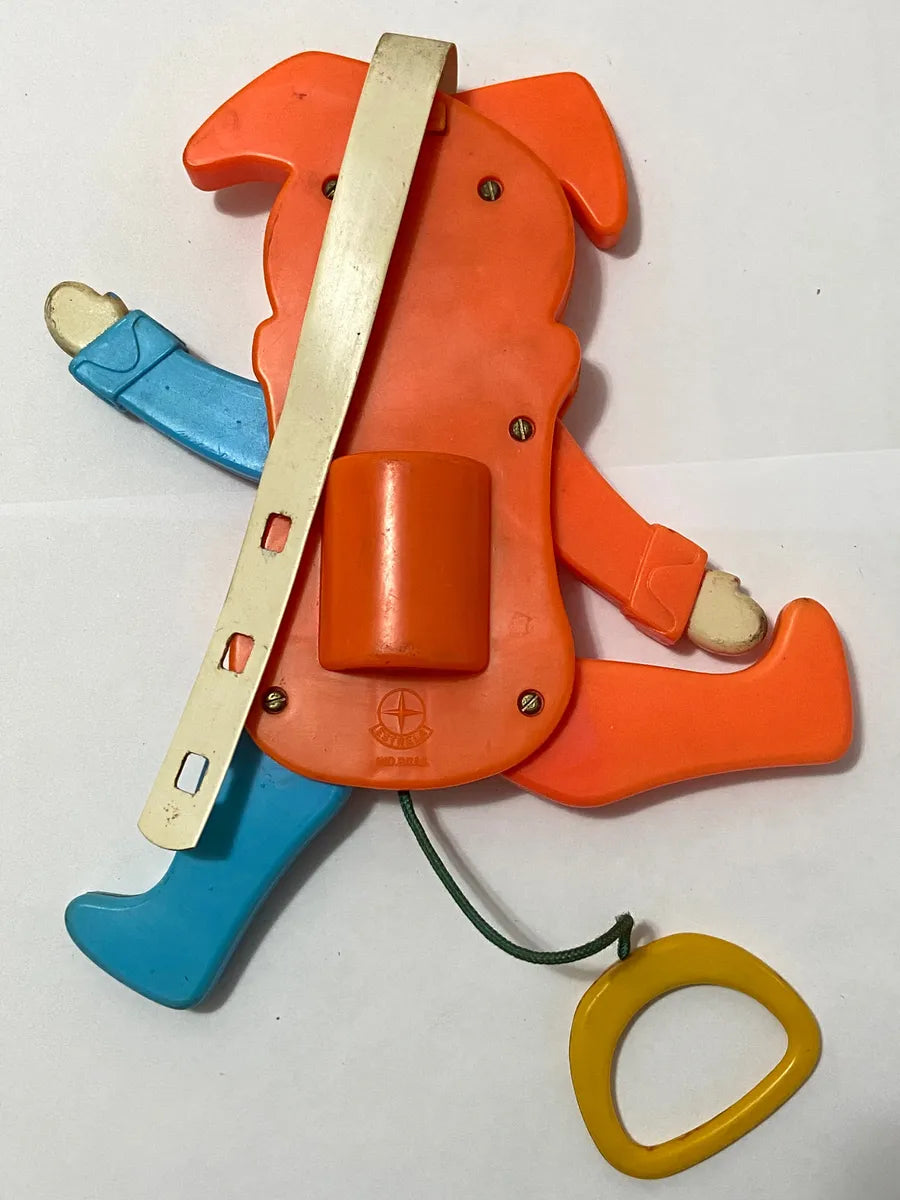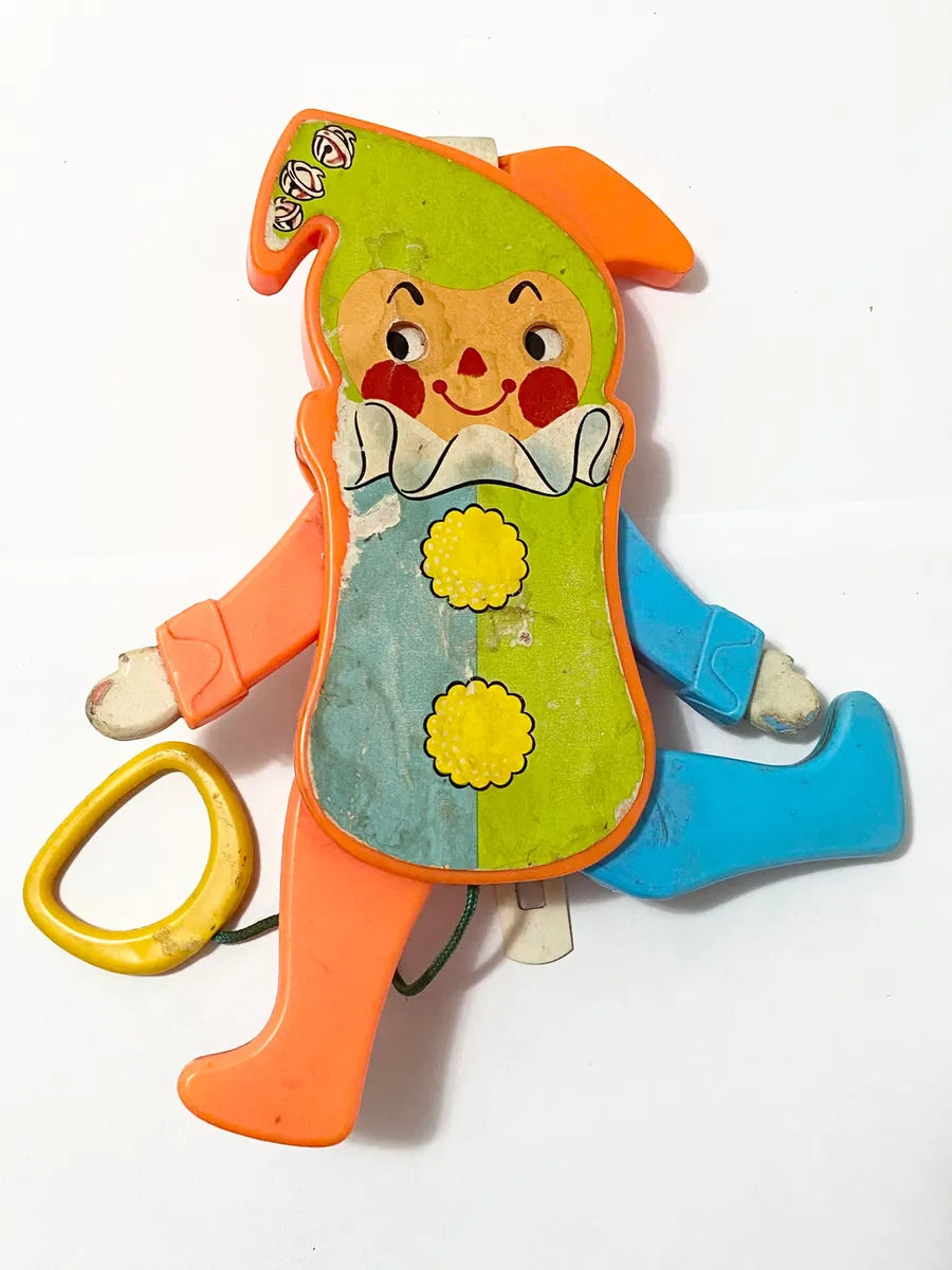 Raro brinquedo antigo da marca Estrela, fabricado no Brasil. Modelo articulado em formato de palhacinho, com pernas e braços móveis ativados por cordão.