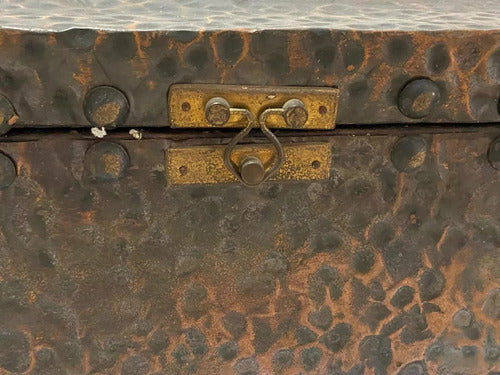 Caixa vintage em cobre repuxado com relevante textura martelada e belíssimo alto-relevo de dois peixes na tampa. Há uma marcação visível, mas que não foi possível confirmar como assinatura de artista conhecido, podendo se tratar de selo, estúdio ou outra identificação. A pátina e execução artesanal conferem autenticidade e apelo decorativo significativo.