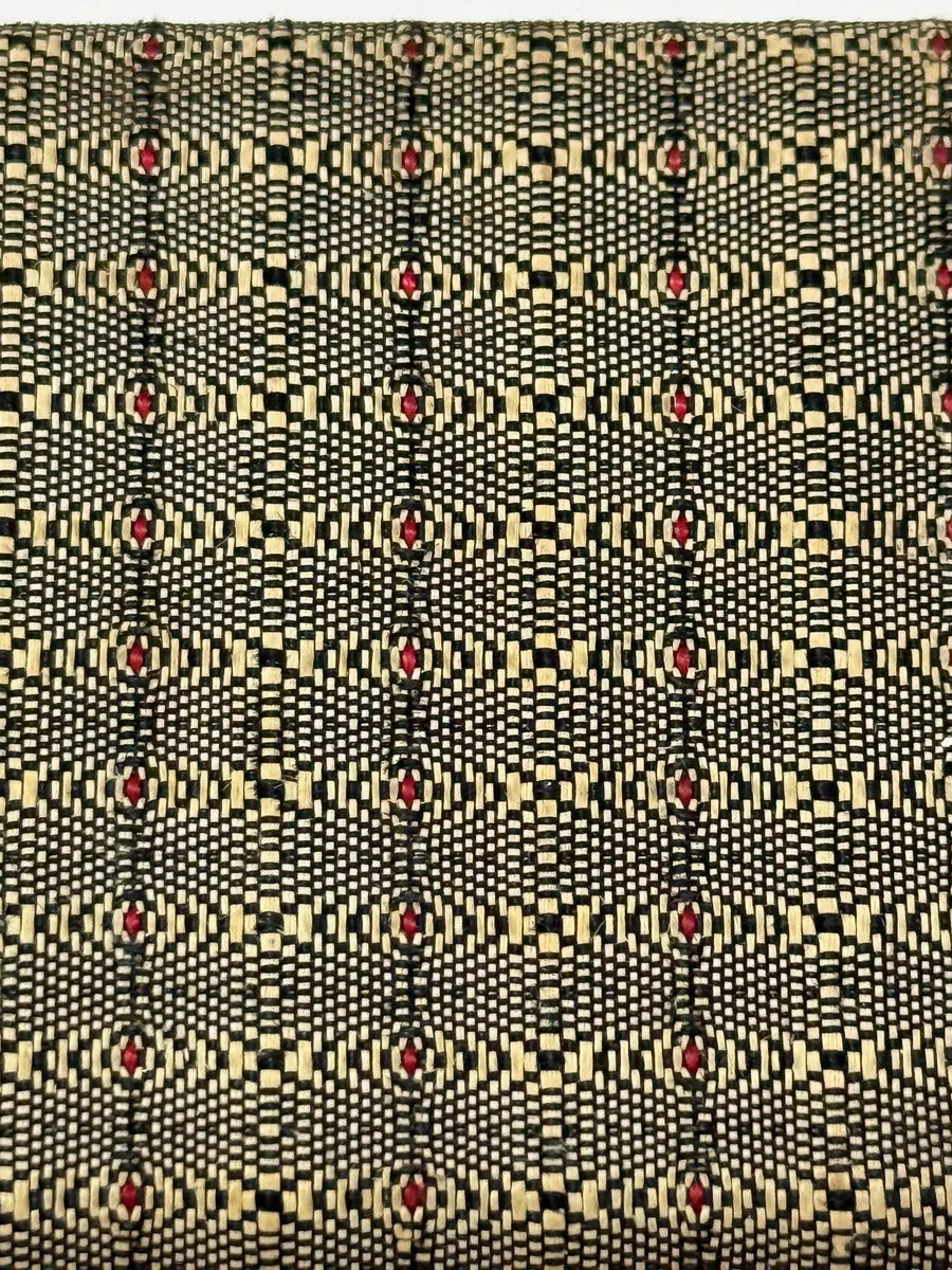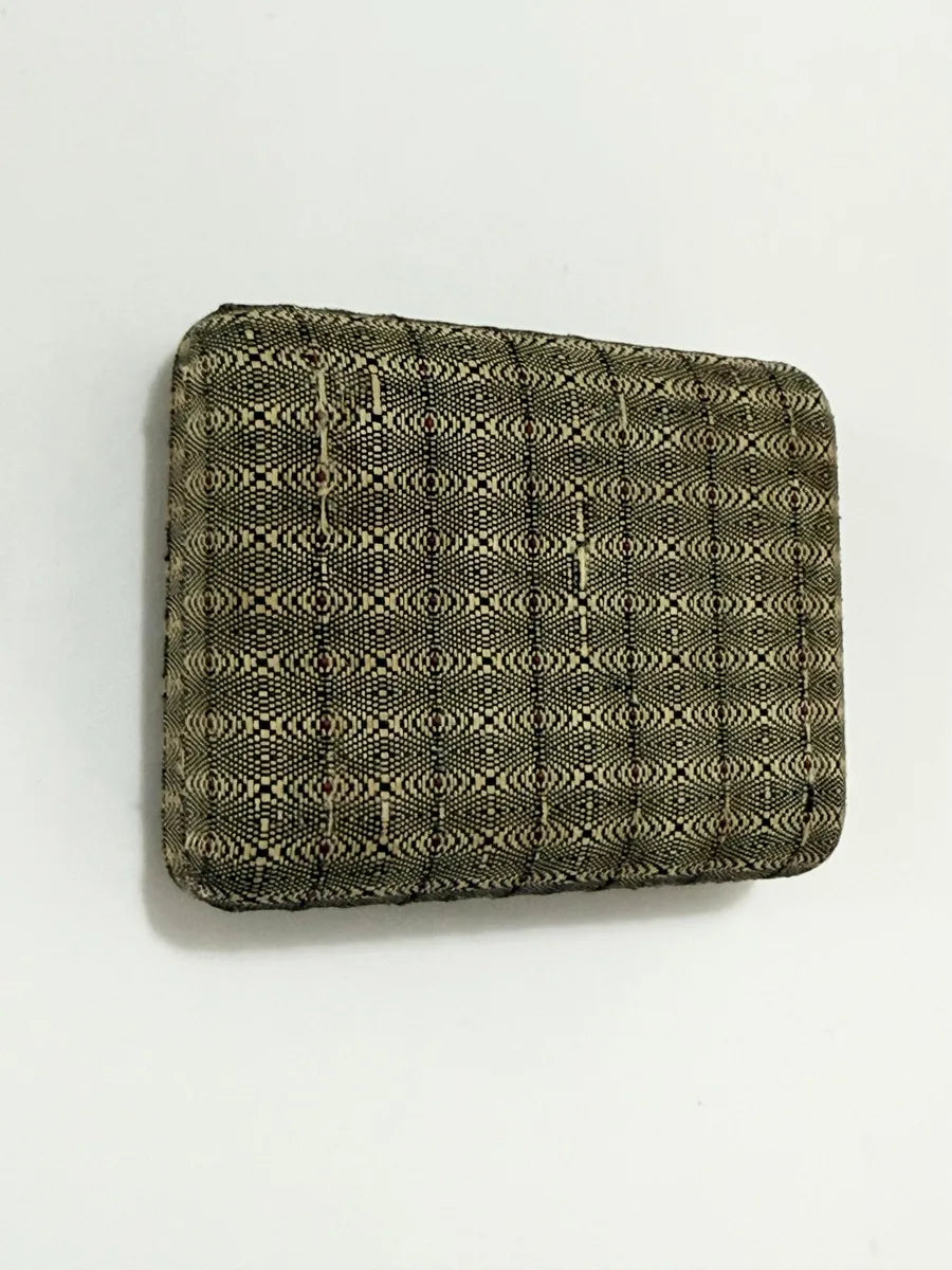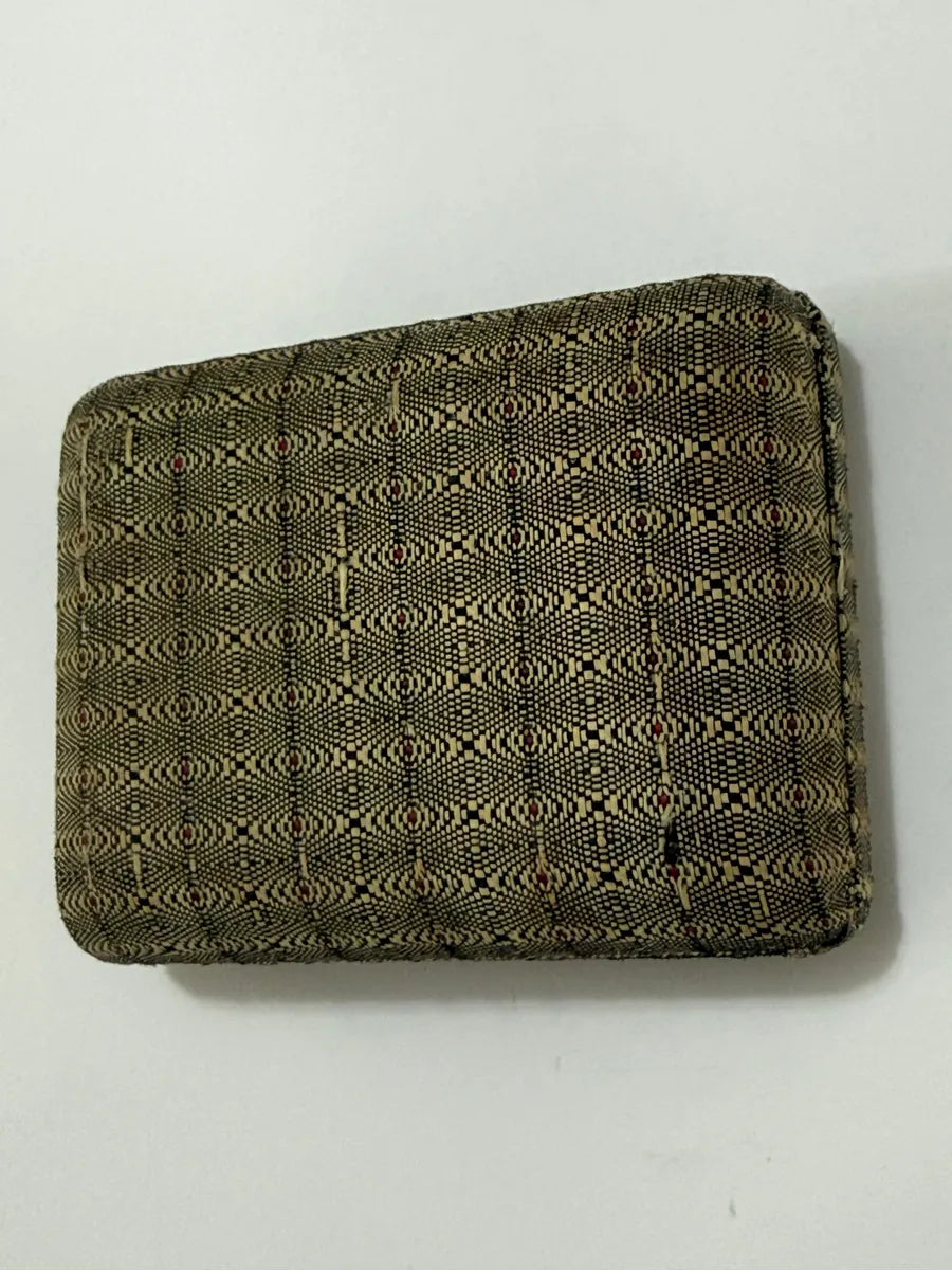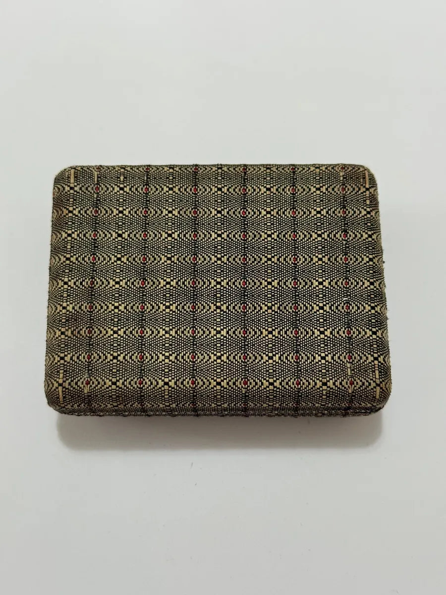 Porta-joias antigo forrado em tecido decorativo com padrão geométrico em tons de bege, preto e detalhes em vermelho. O interior é revestido com tecido acetinado claro.