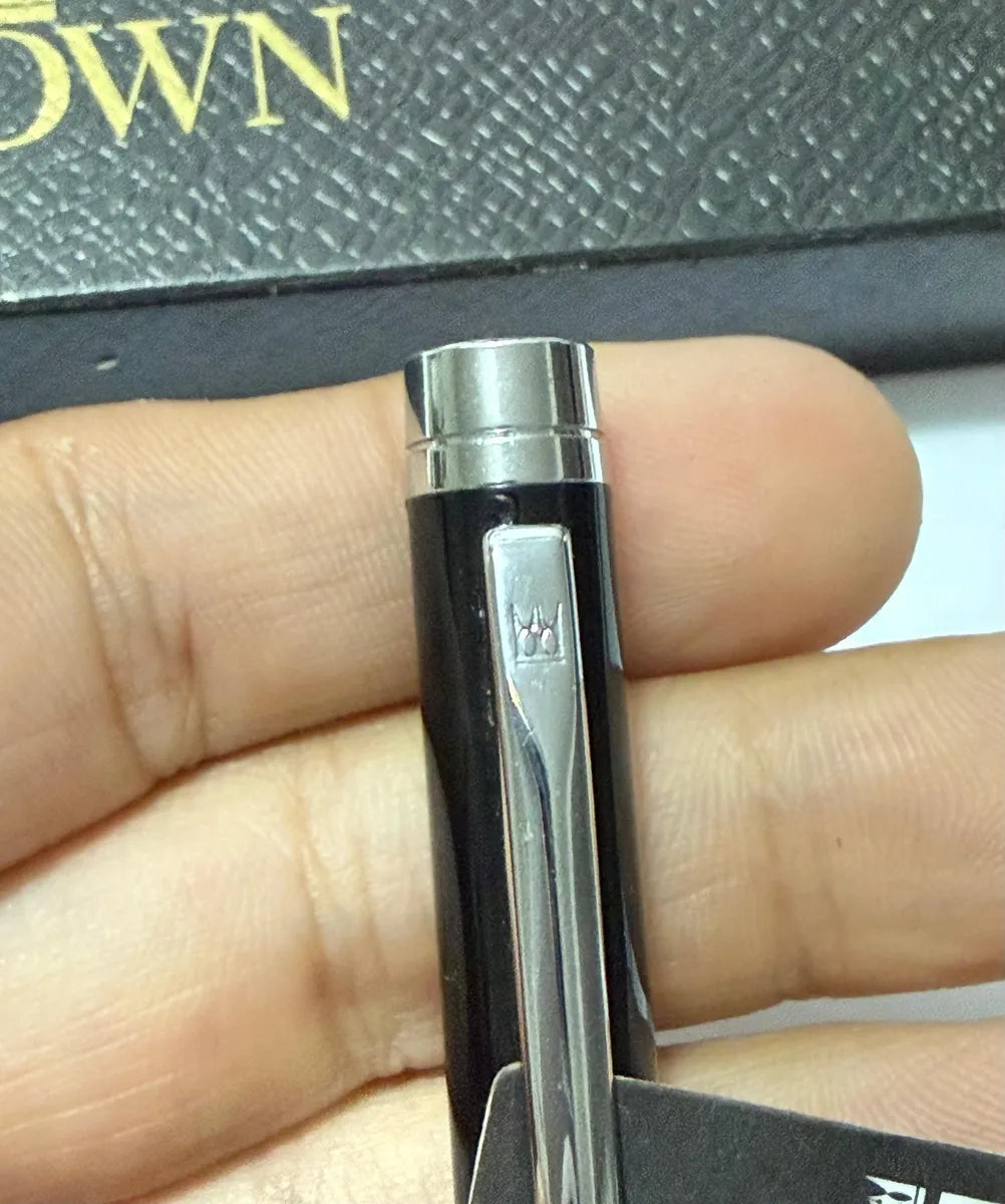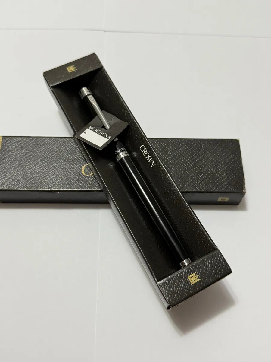 Caneta tinteiro da marca Crown, cor preta com detalhes cromados, acompanha estojo original.