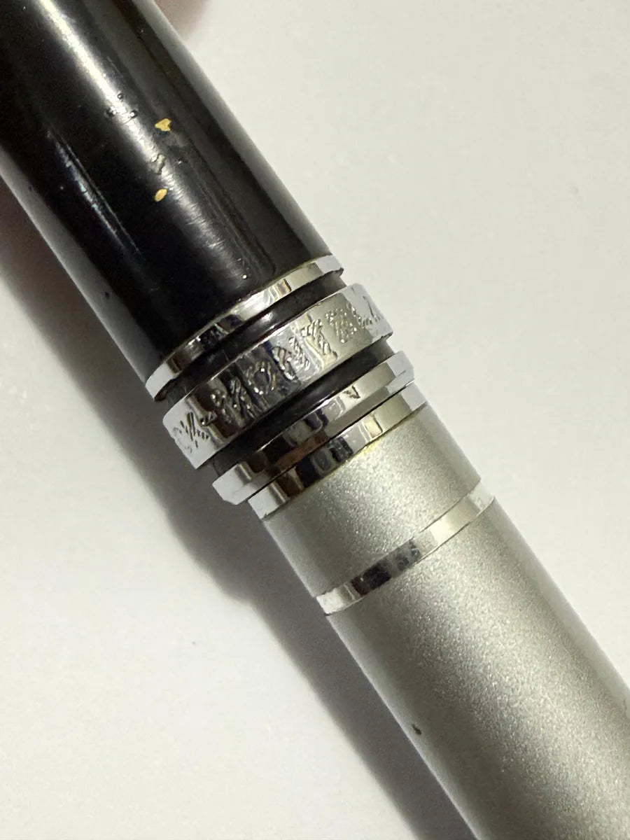Caneta tinteiro Montblanc Meisterstück antiga, corpo preto com detalhes prateados e emblema branco no topo. Anel gravado “MEISTERSTÜCK”. Pena marcada “BRILBO MEDIUM” (pena substituída). Possui reservatório/conversor. Vendida no estado, conforme fotos.
