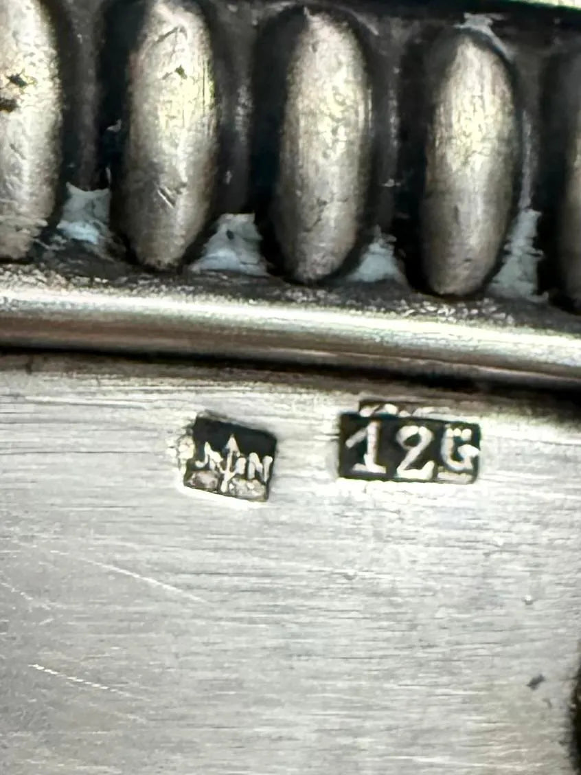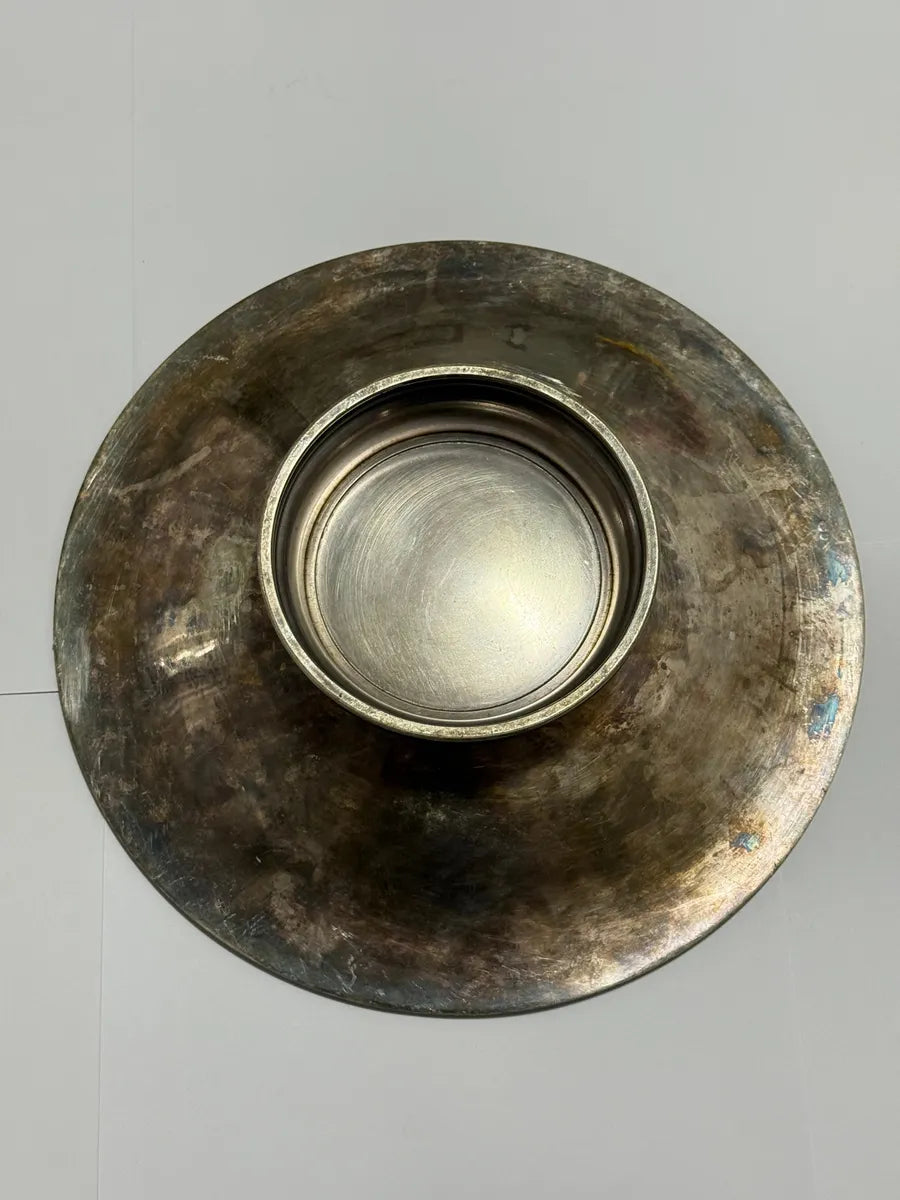 Centro de mesa antigo prateada, com borda trabalhada e detalhes em concha. Possui marcação “12G” e punção do fabricante. Peça com patina natural do tempo, conforme fotos. Ideal para decoração, mesa posta ou fruteira baixa. Medidas: 26,5cm x 6cm.