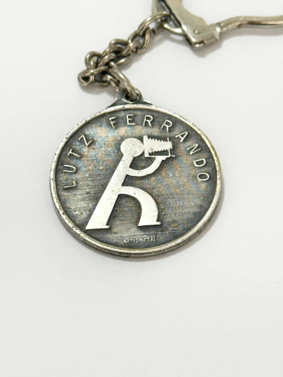 Chaveiro antigo em metal da Lutz Ferrando, fabricado pela Artismetal, peça vintage com forte apelo histórico e colecionável. Apresenta medalhão circular com logotipo em relevo e corrente original.