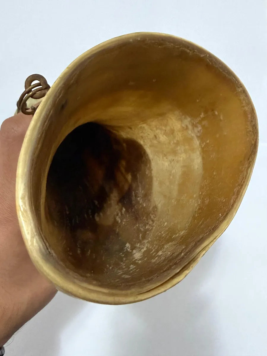 Rara guampa/copo antigo confeccionado em chifre natural, lindamente entalhado à mão com a figura de um boi em relevo.