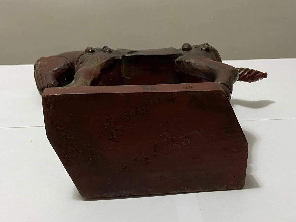 Escultura artesanal em madeira laqueada, representando um cavalo em com detalhes de sela e arreios entalhados. A peça possui acabamento em laca avermelhada, típico de trabalhos orientais.