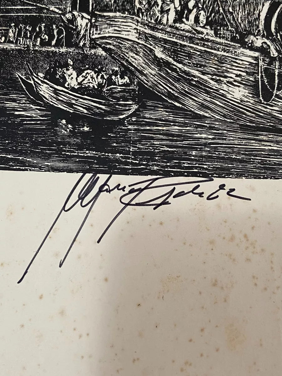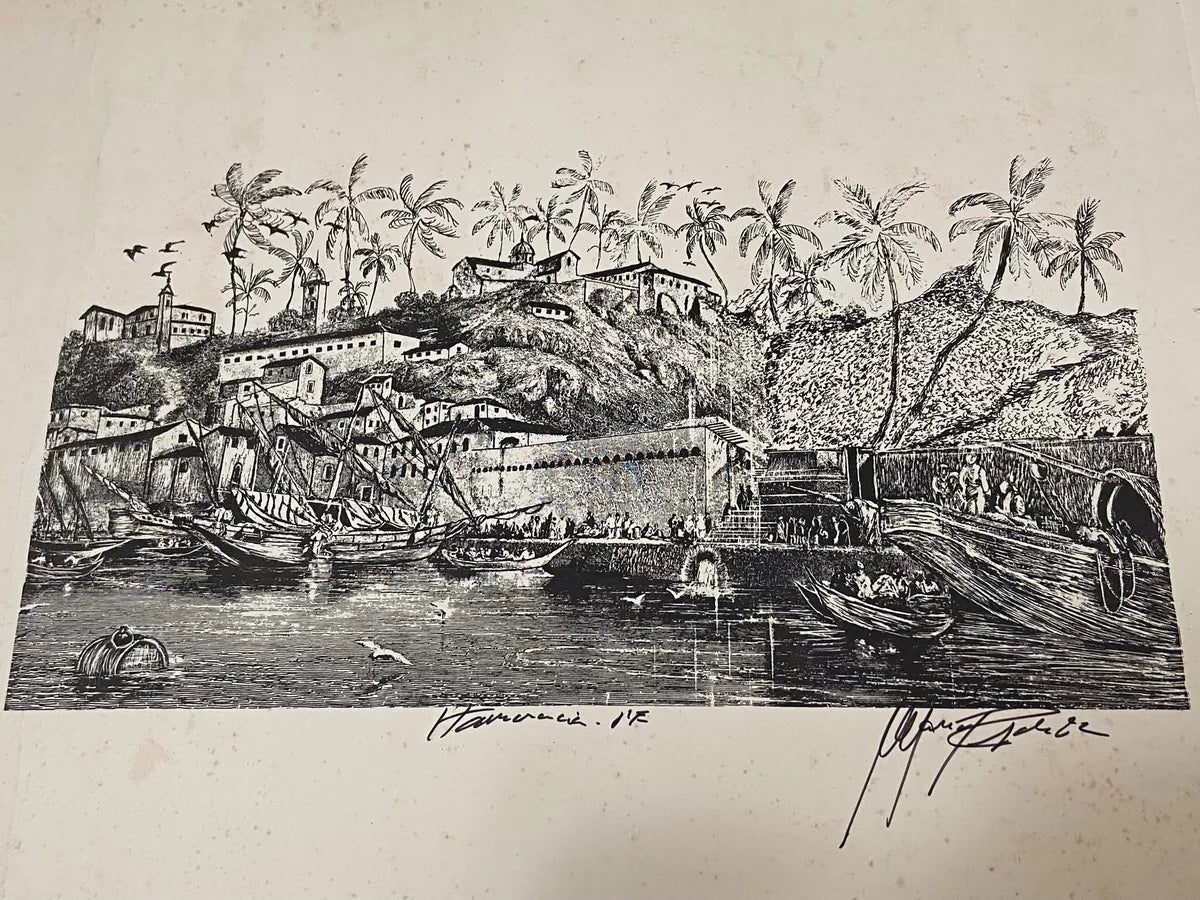 Gravura Antiga Porto Colonial Com Embarcações Assinada