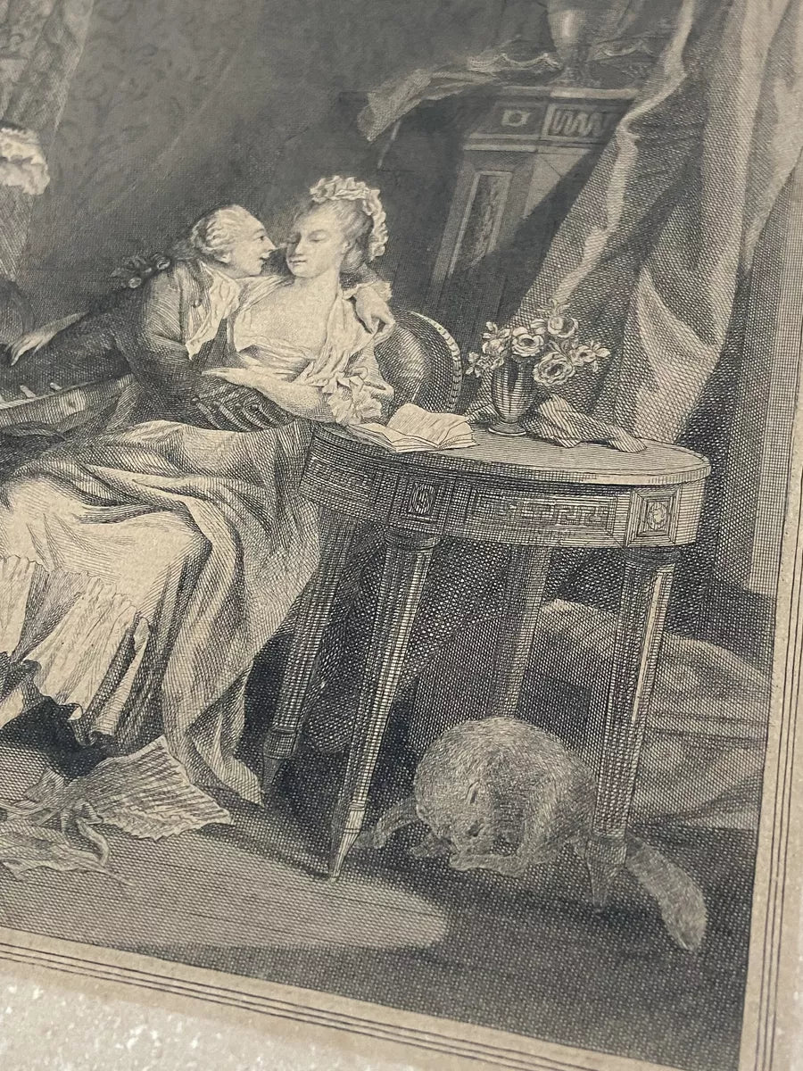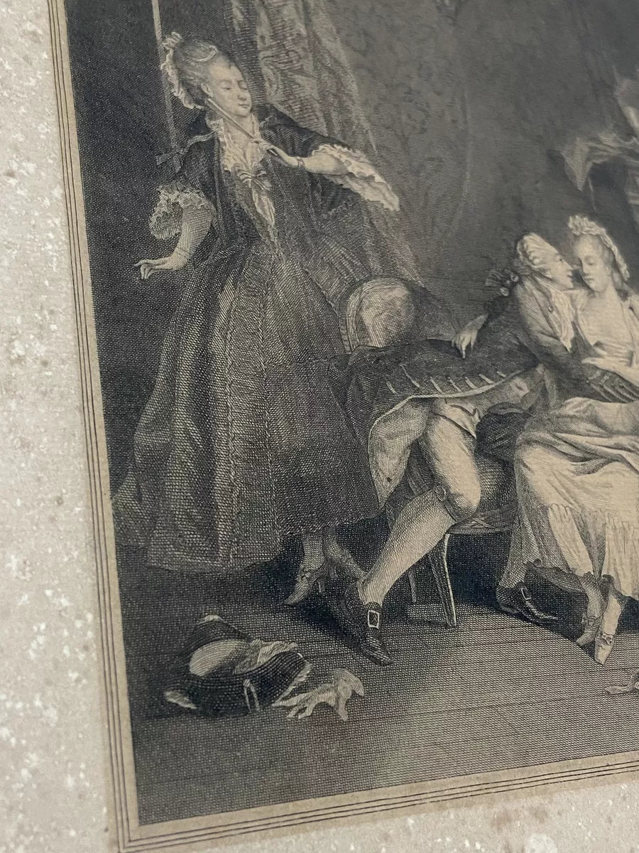 Gravura antiga em papel envelhecido, possivelmente do século XVIII/XIX, representando uma cena romântica em ambiente aristocrático. Apresenta sinais do tempo, mas mantém grande valor decorativo e colecionável.