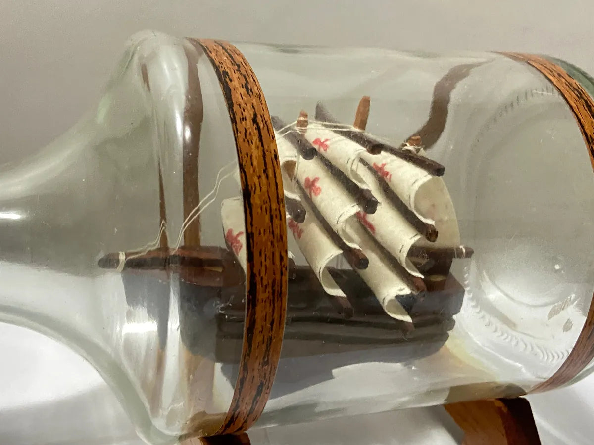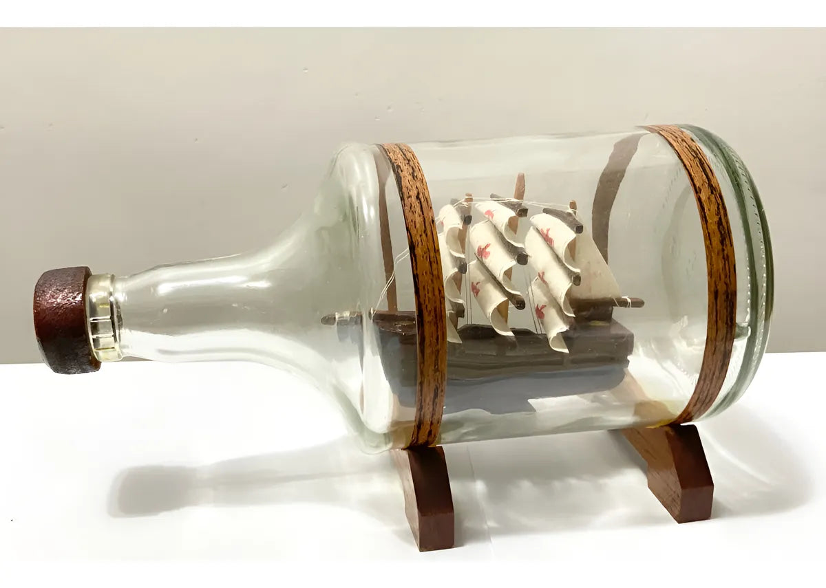 Miniatura Antigo Navio Em Garrafa De Vidro E Base De Madeira