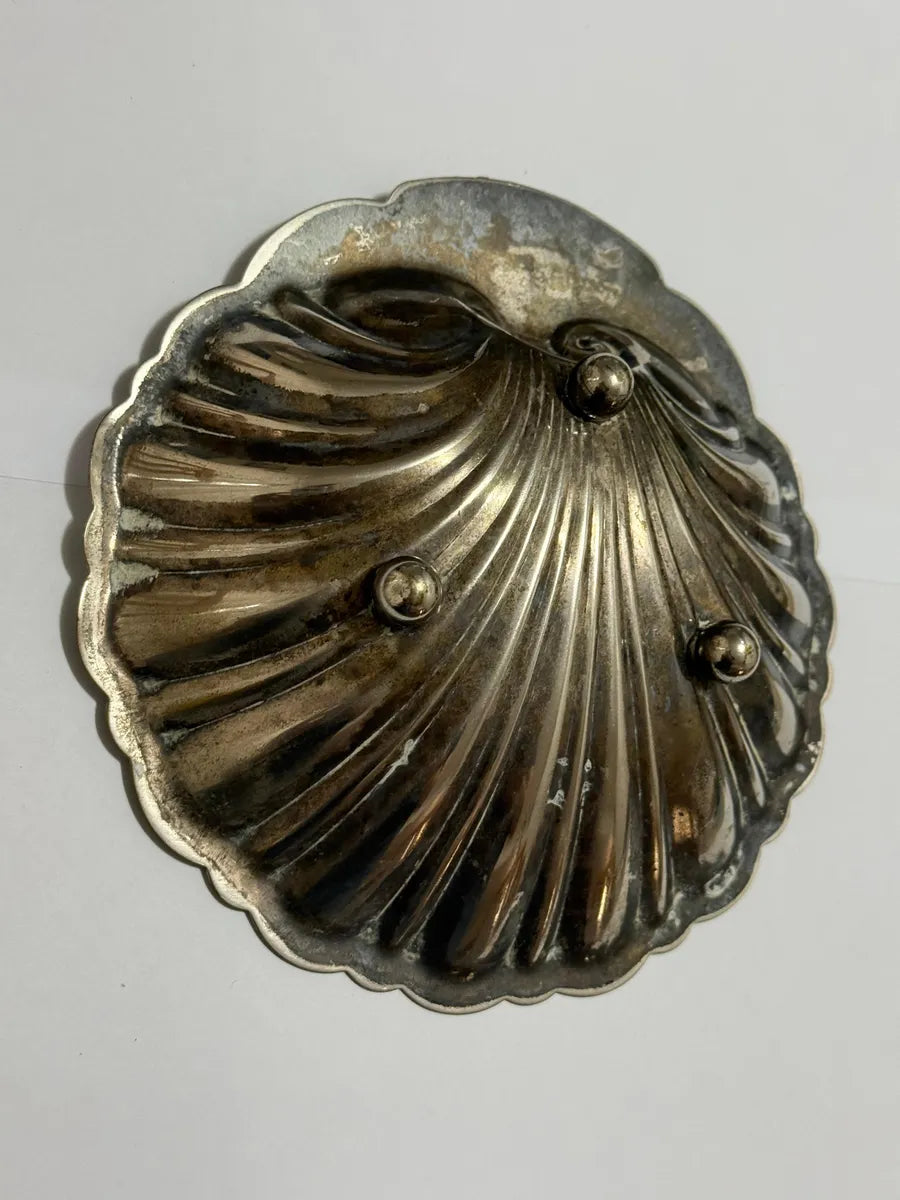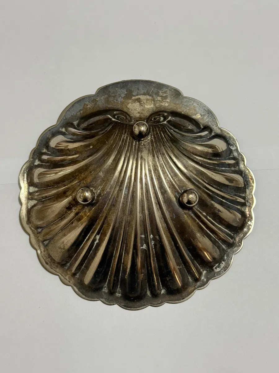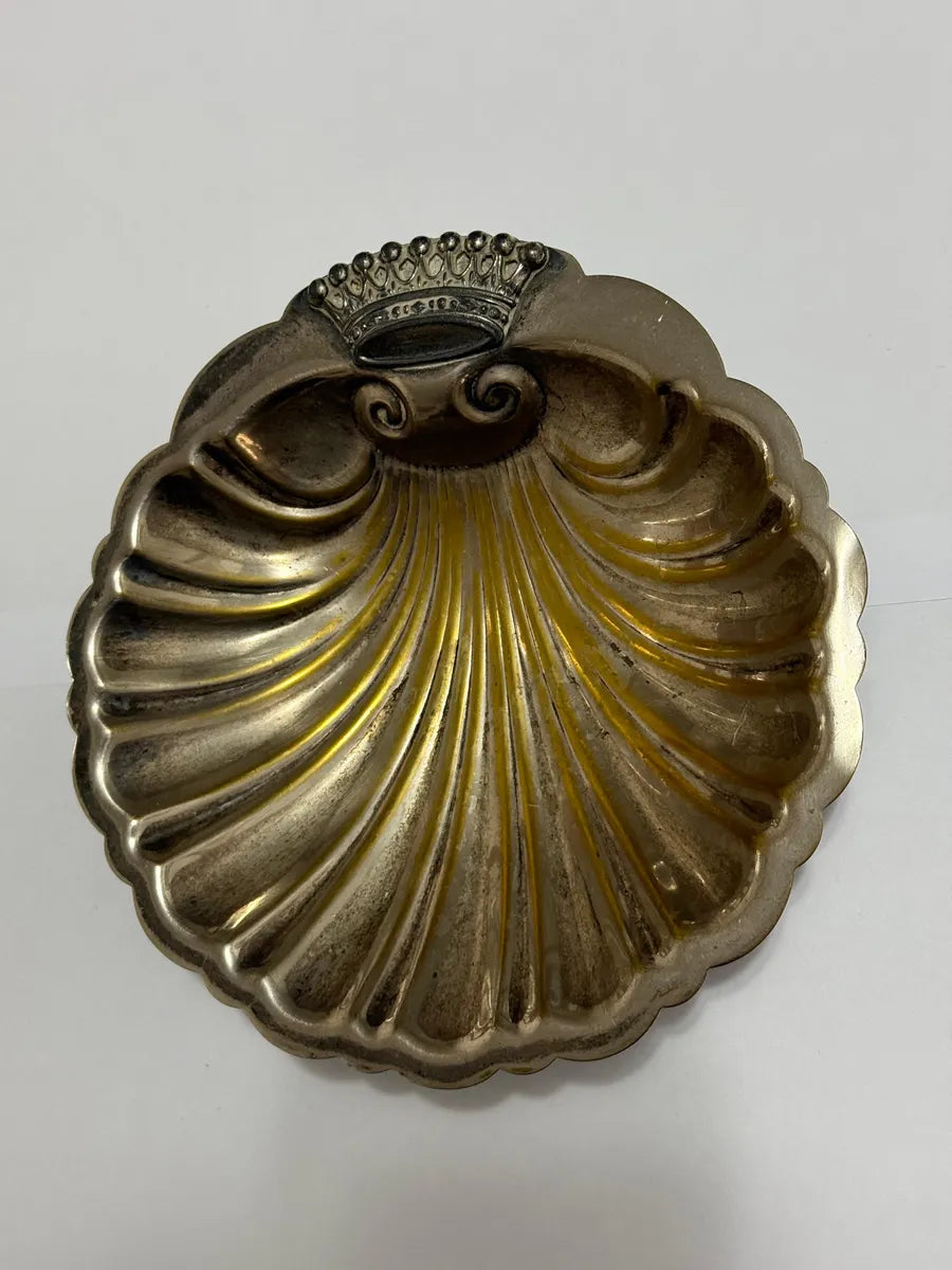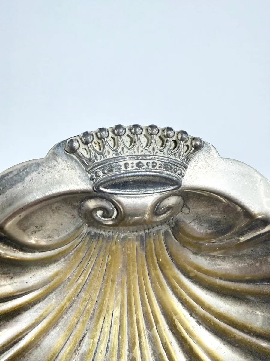 Peça decorativa antiga em formato de concha, produzida em metal prateado com acabamento dourado interno e detalhe superior em forma de coroa. Ideal para uso como porta-joias, bomboniere, cinzeiro ou item de coleção. Possui base com três pés esféricos para apoio.