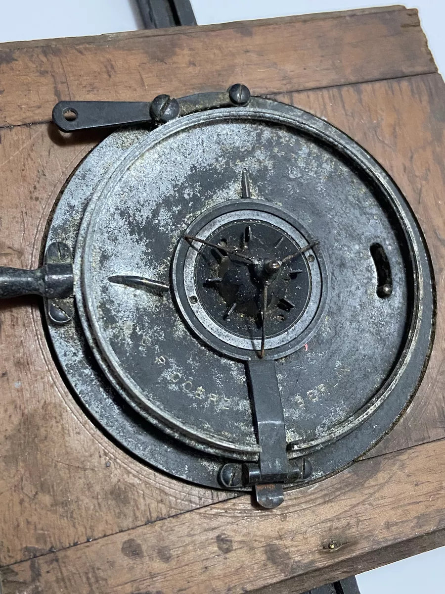 Acabamento em madeira com pátina autêntica, fissuras naturais e marcas do tempo — reforçando seu valor como peça de coleção.