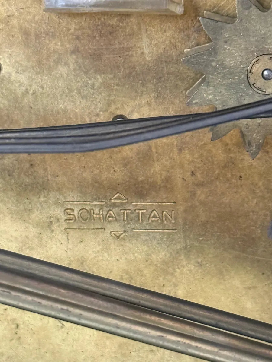 Relógio antigo Schattan, fabricado no Brasil, modelo mecânico a corda com carrilhão, em caixa de madeira maciça, original de época.