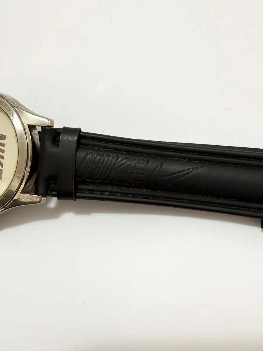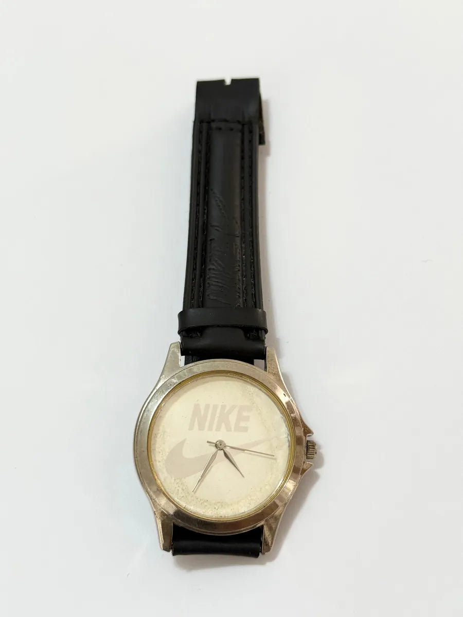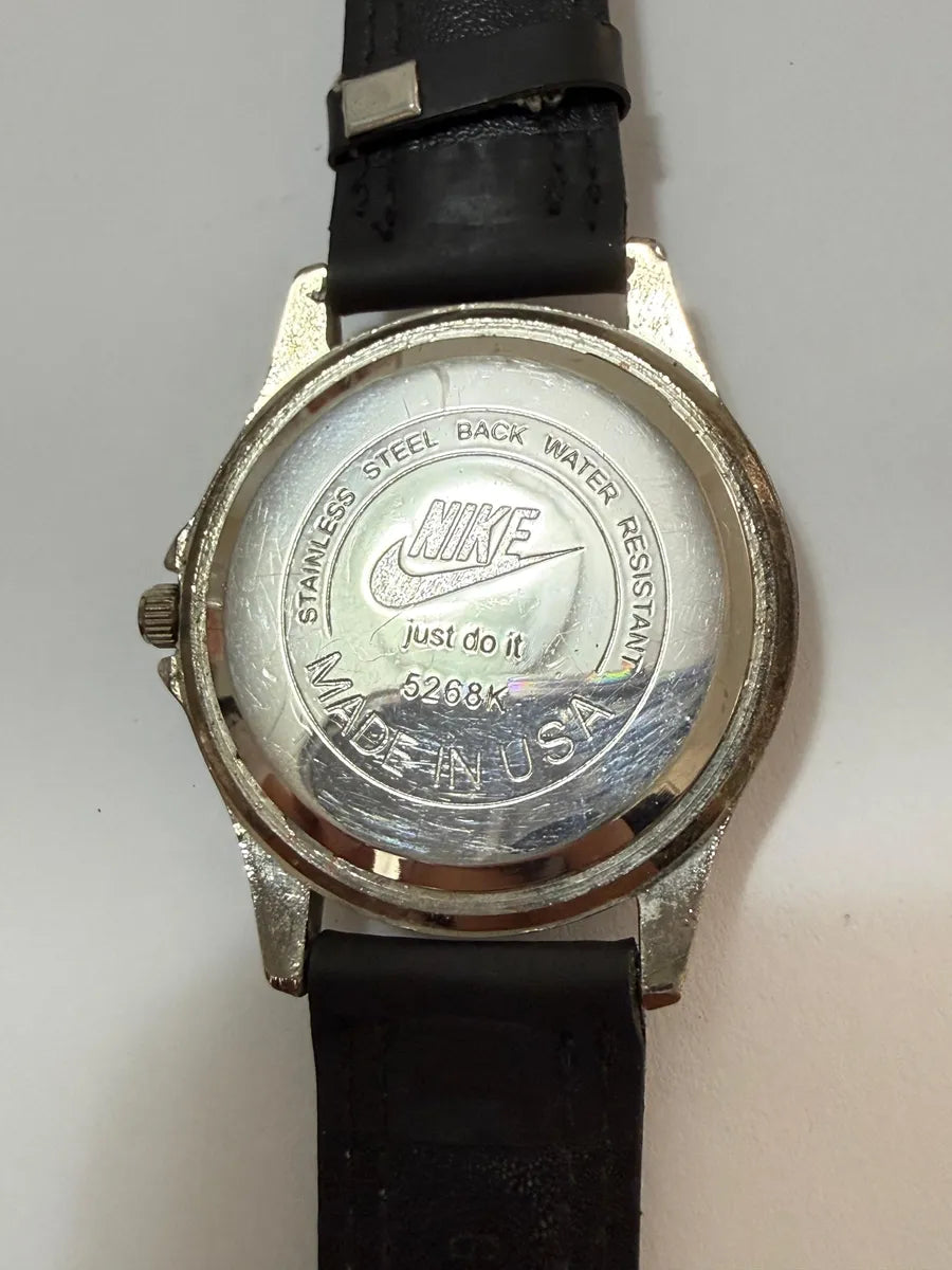 Relógio de pulso antigo com logotipo NIKE e inscrição "Just Do It" na tampa traseira. Peça de colecionador rara, possivelmente fabricada nos anos 90, com estilo esportivo clássico e mostrador simples.