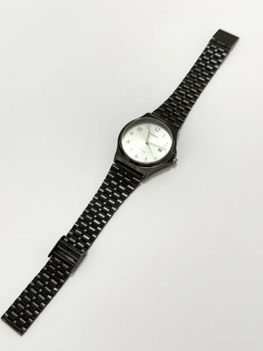 Relógio Casio original, modelo analógico com calendário (data) e resistência à água WR 50M. Mostrador claro com números arábicos, leitura fácil e design clássico. Pulseira metálica na cor preta. Relógio funcionando normalmente.