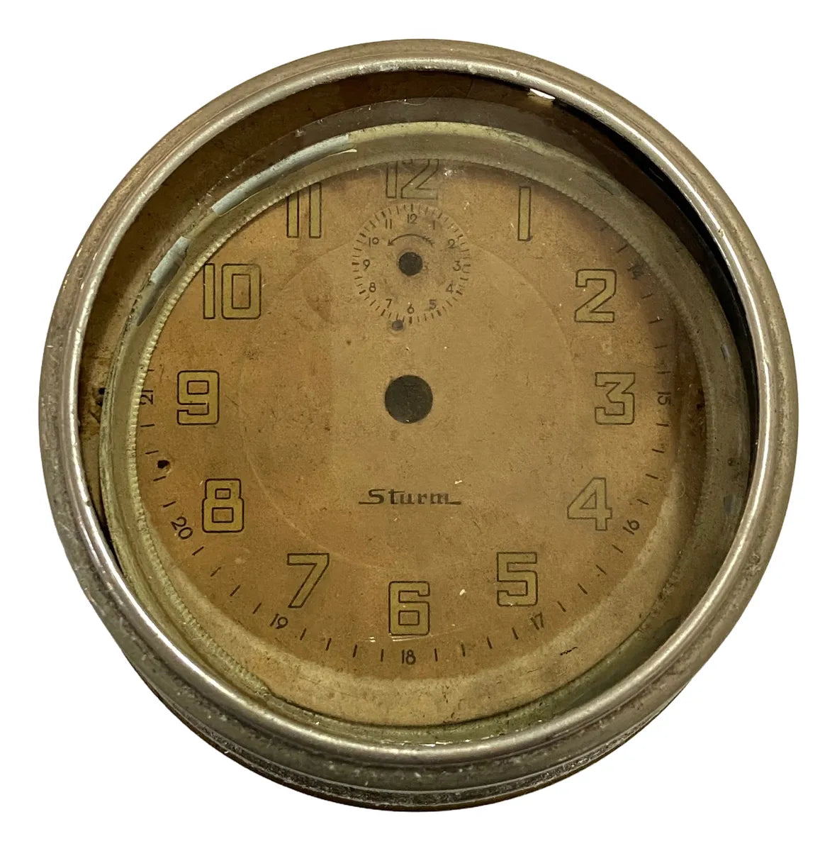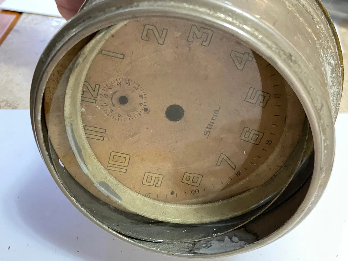 Raro relógio de painel antigo da marca Sturm, fabricado possivelmente entre as décadas de 1940 e 1950. Este modelo era comum em veículos europeus da época, como automóveis, caminhões e tratores.