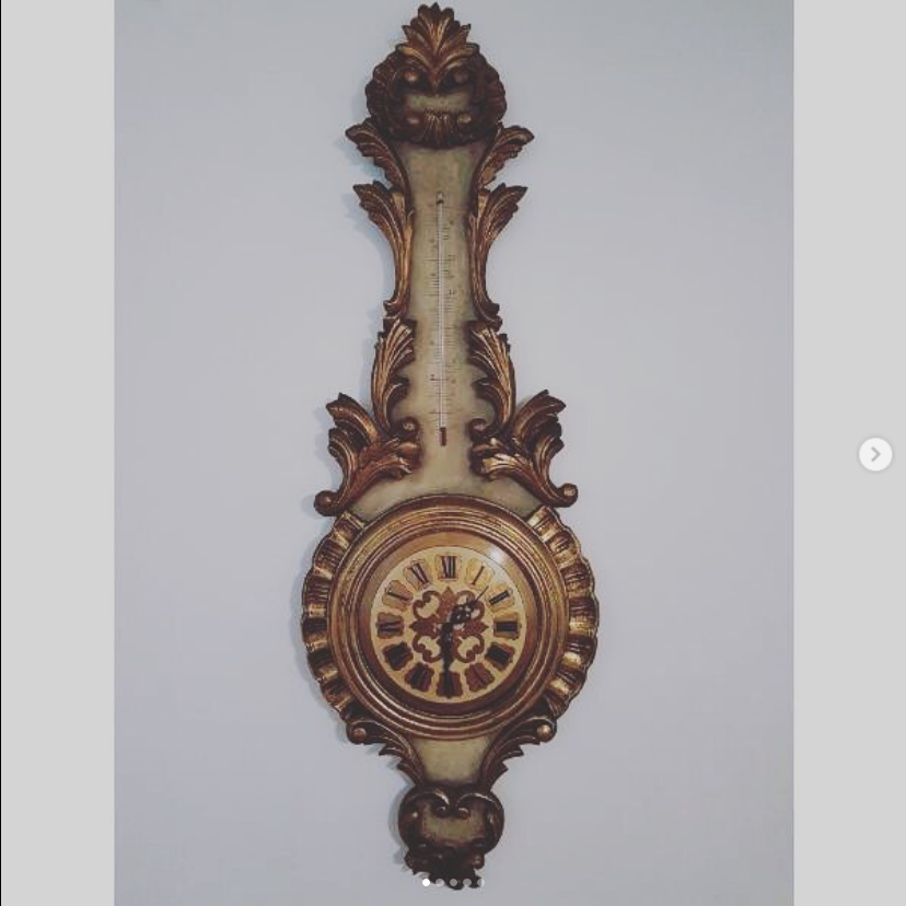 Relógio analógico e termômetro integrado. Estrutura trabalhada com detalhes dourados em estilo clássico. Funcional e ideal para decorar ambientes como salas, halls ou escritórios. Em ótimo estado de conservação.