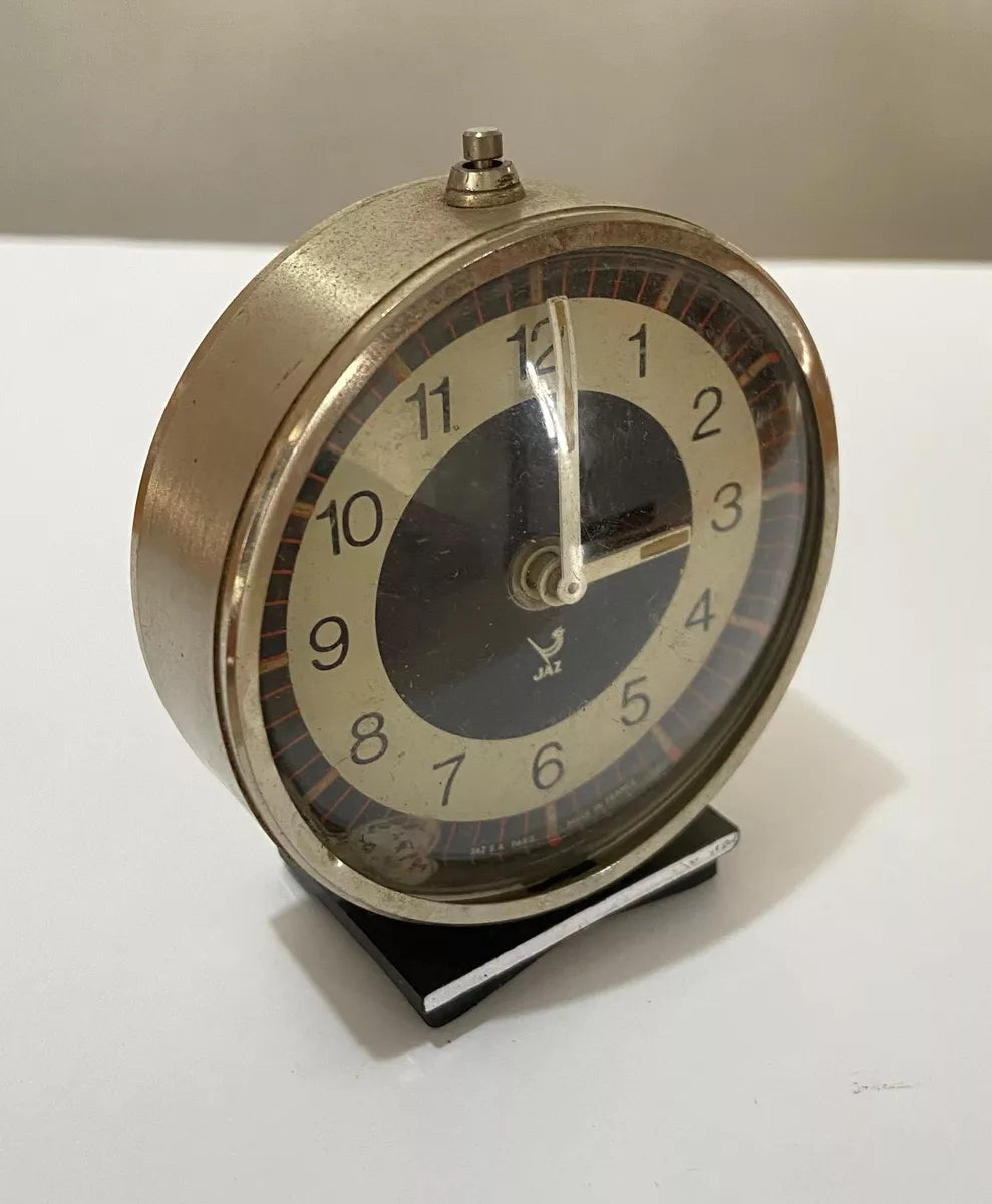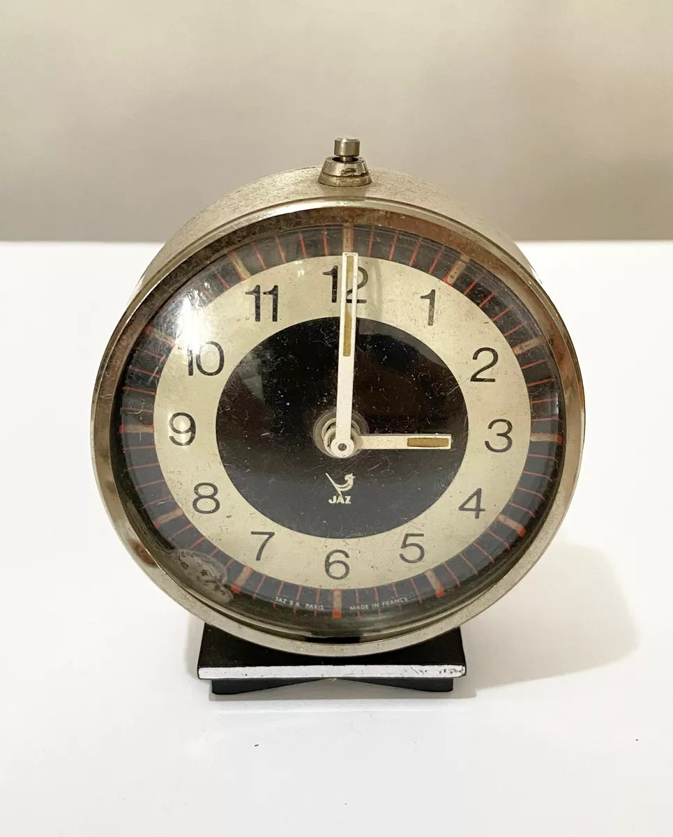 Despertador antigo do fabricante francês Jazz. Relógio mecânico dos anos 1970, relógio preto e prata