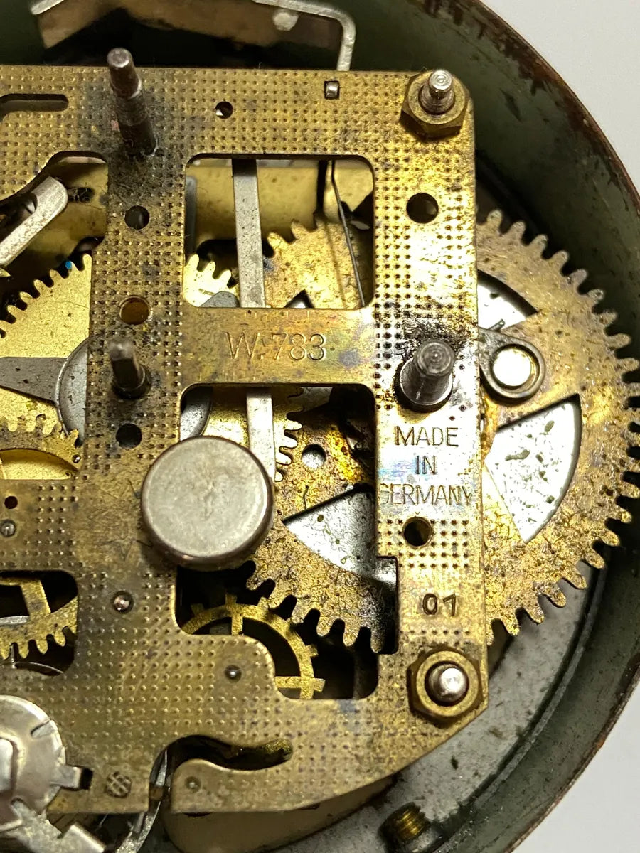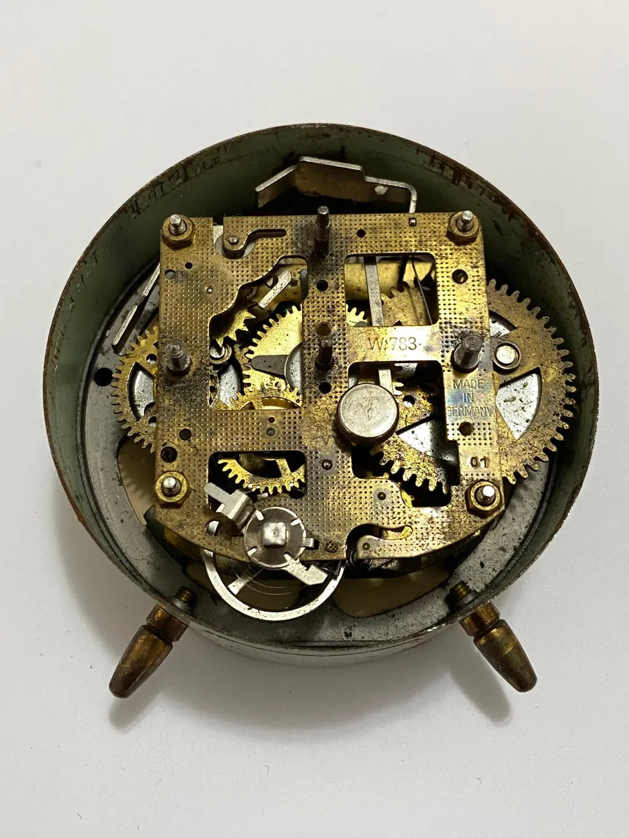 Relógio despertador antigo da marca Junghans, fabricado na Alemanha, com mostrador original e mecanismo interno marcado "Made in Germany" e código W783.