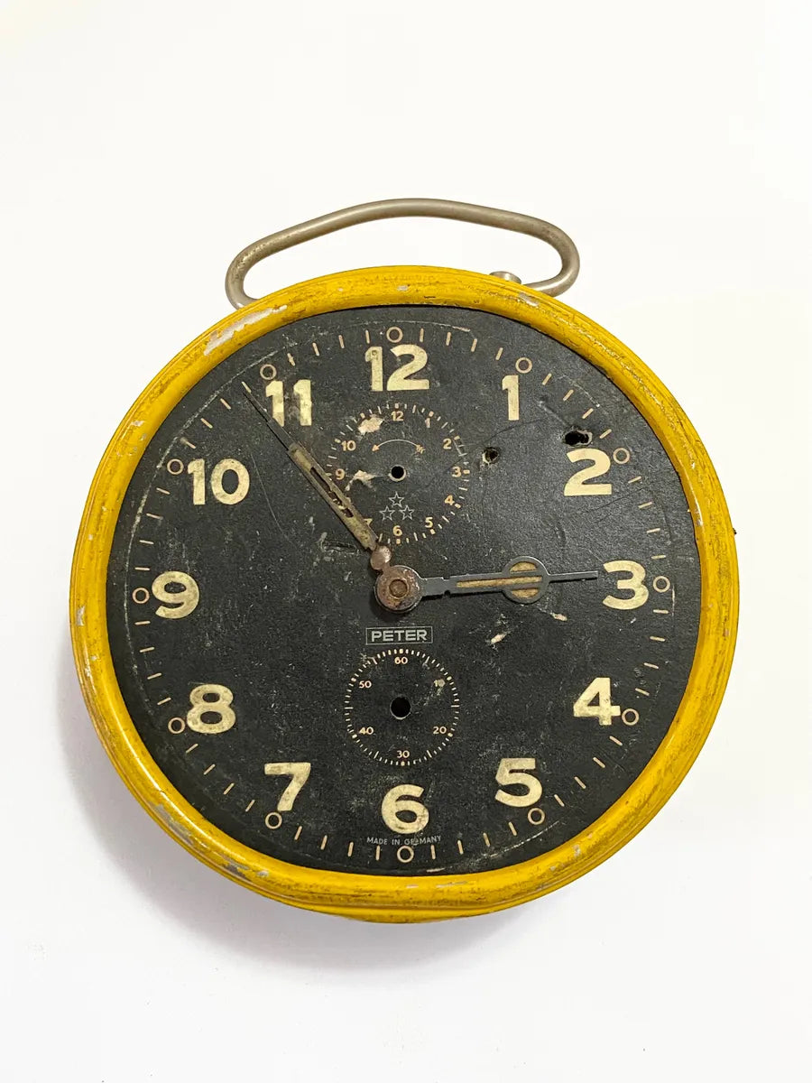 Relógio despertador mecânico antigo da marca Peter, fabricado na Alemanha Ocidental, provavelmente entre as décadas de 1950 e 1960. Estrutura em metal com pintura amarela original e mostrador preto com números grandes em estilo retrô.