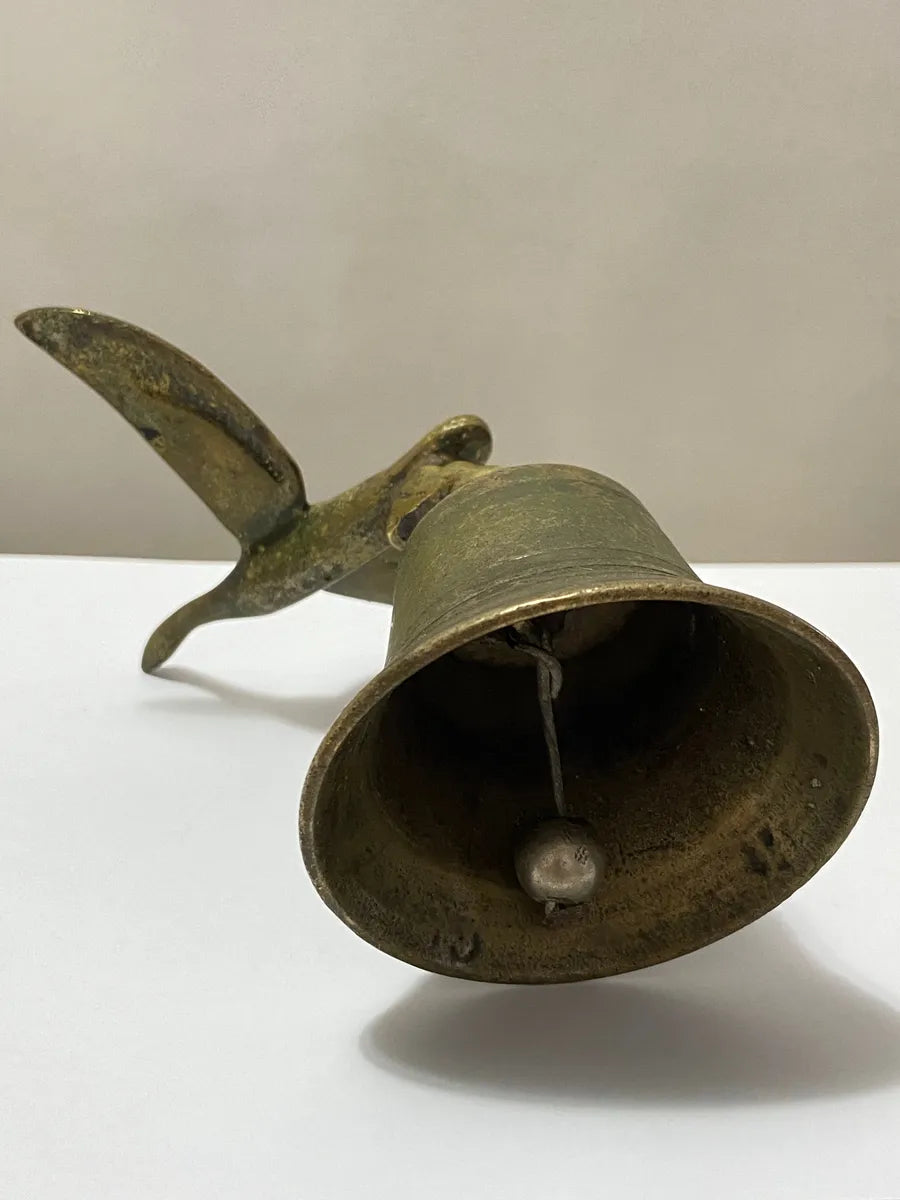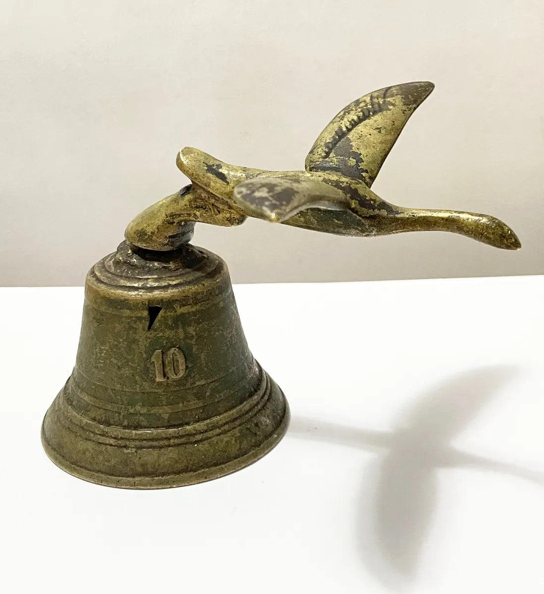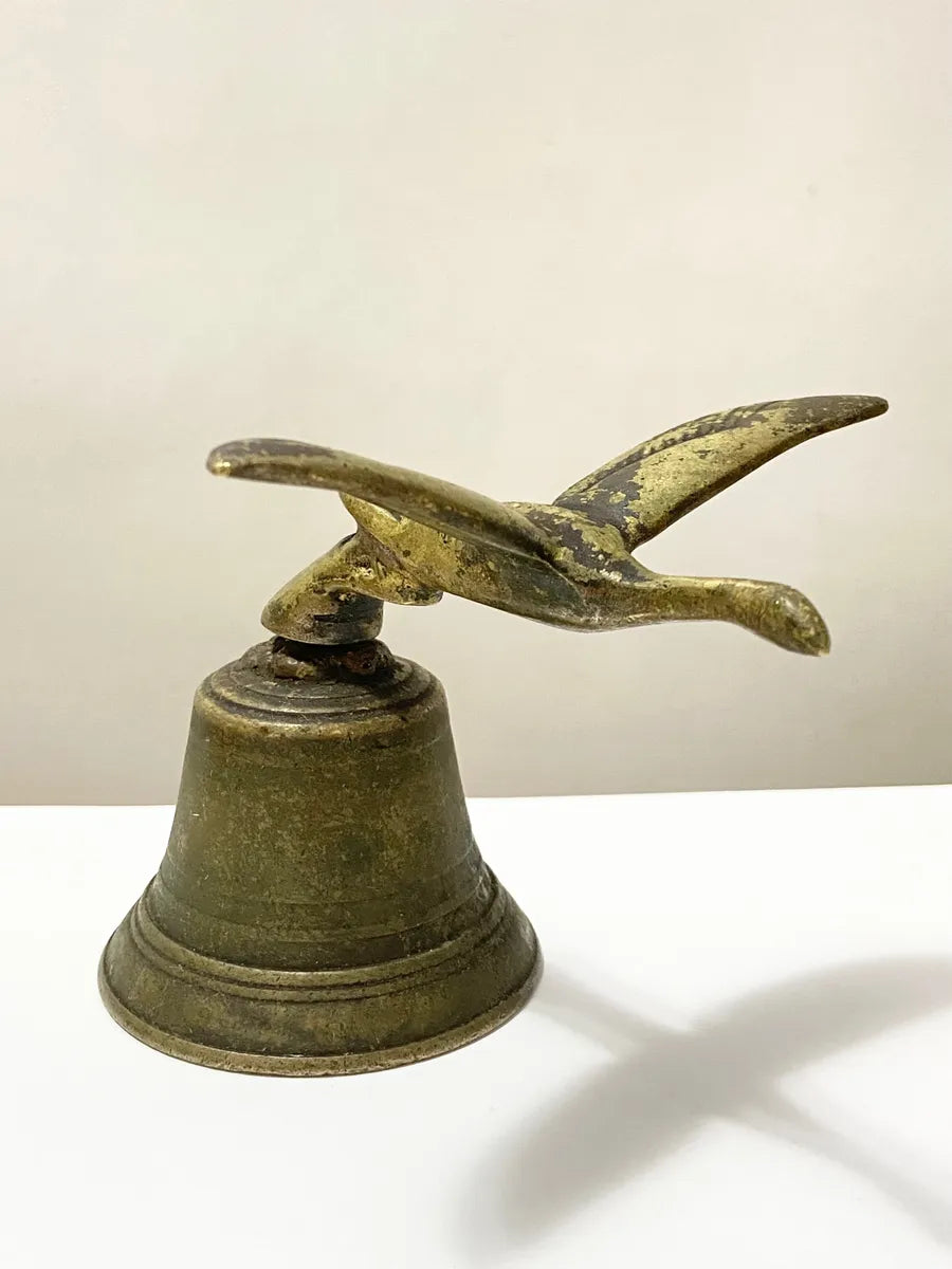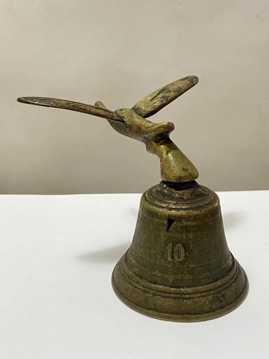 Sino decorativo antigo em bronze maciço, com 11 cm de altura e detalhe em forma de pássaro no topo. A peça possui o número “10” em alto-relevo na base e apresenta uma belíssima pátina natural do tempo, evidenciando sua idade e autenticidade.