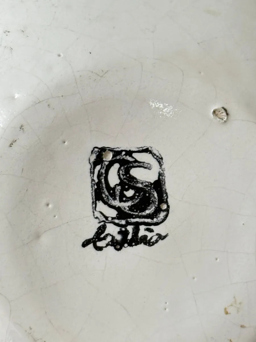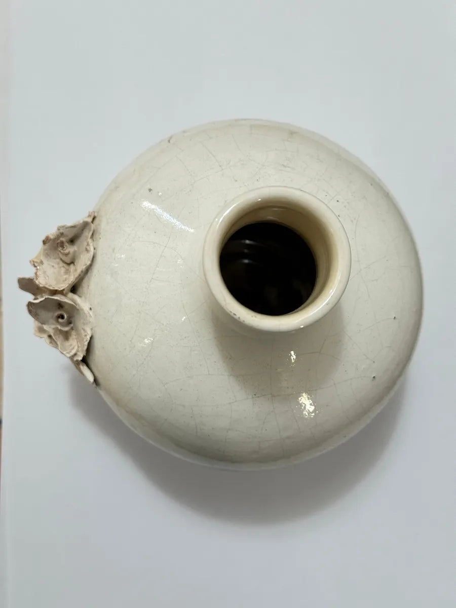 Vaso decorativo antigo em cerâmica branca com acabamento craquelado, peça artesanal assinada na base. Possui uma bela flor modelada em alto-relevo na parte frontal, dando um toque rústico e artístico.